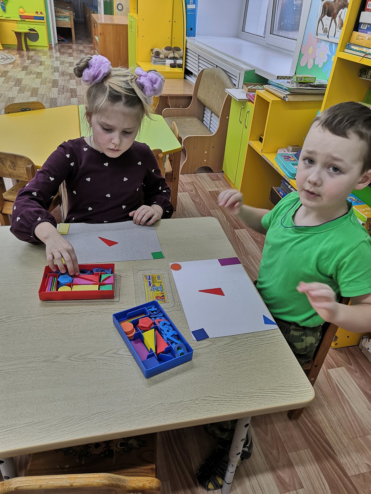 В группе "Ромашка"прошло занятие по ФЭМП. Ребята упражнялись в ориентировке на плоскости листа, учились раскладывать геометрические фигуры в определенной части листа, запоминать какие фигуры и где надо положить,закрепили навыки счета в пределах 10. В игре "Цветная неделька" уточнили последовательность дней недели.В конце занятия дети составляли изображения из геометрических фигур, определяли из каких фигур состоит изображение.