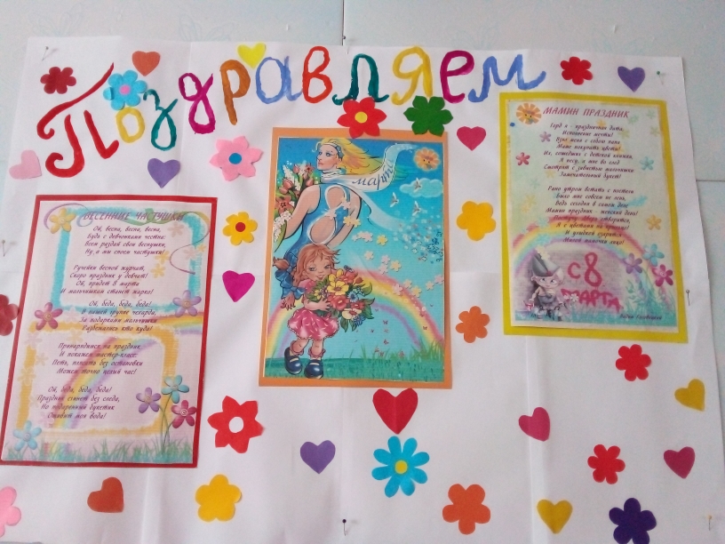 8 марта - день особенный , День радости и красоты. На всей земле он дарит женщинам , свои улыбки и цветы. К этому дню ребята группы " Солнышко " очень упорно готовились ,: беседовали о мамах., бабушках. Читали рассказы , учили стихи , рисовали весенние цветы . Сделали поздравительную стенгазету. Воспитатель : Лебедева Л. Е.