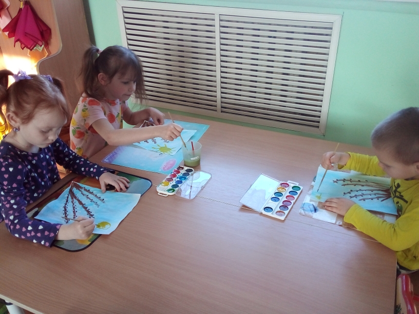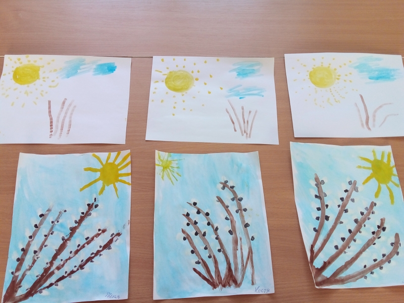 В группе " Солнышко" , прошло занятие по рисованию на тему " Весна пришла " старшие ребята нарисовали куст " Вербы " , а младшие , ватными палочками рисовали лучики у солнышка . В процессе занятия ребята закрепляли умение изображать картины природы , учились располагать рисунок по всему листу . Воспитатель : Лебедева Л. Е.